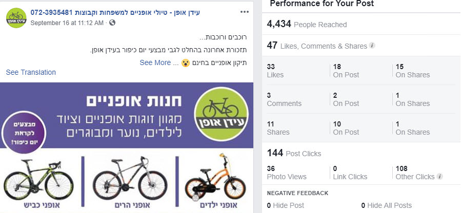 לאחר הכנת אסטרטגיה שיווקית לפייסבוק התחלנו לפרסם תכנים איכותיים בדף. המטרה הייתה לתת לעוקבים מידע איכותי בנושא אופניים ולמתג את עידן אופן כבעל המקצוע הטוב בתחומו.